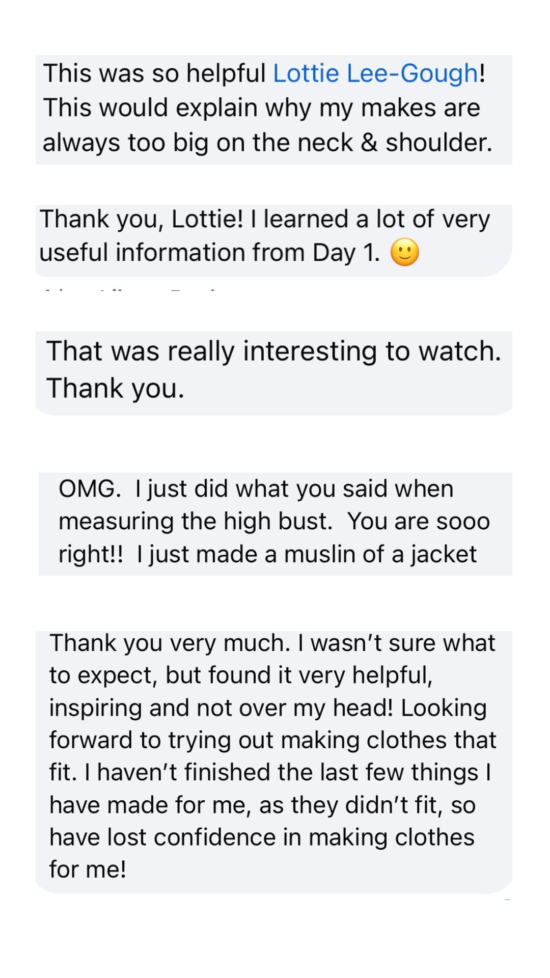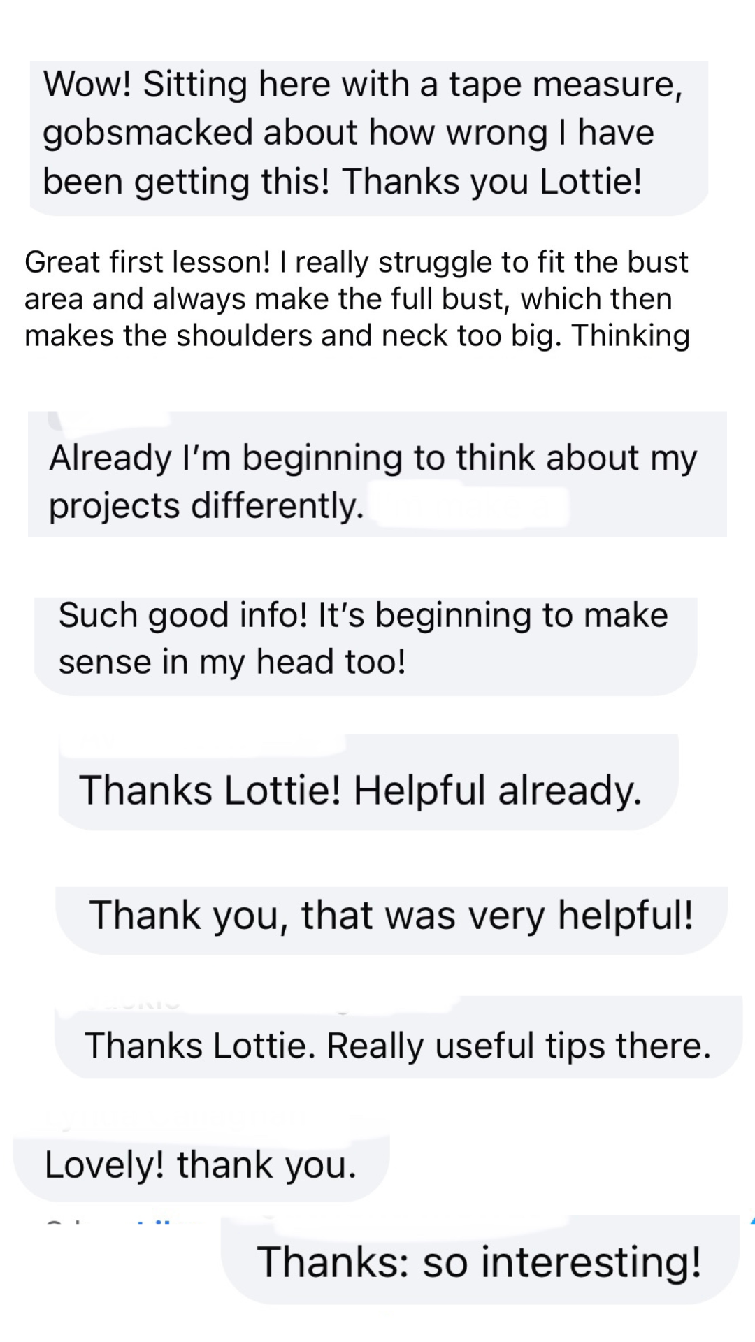 “Lottie can I say a huge thank you for this course! You gave us the tools about sizing and my Sewjo was boosted by my toile fitting so well. I jumped in to remake my Tilda blouse which is a size 44, the last one was a size 50, which was like a 4 man tent on me! 🙈