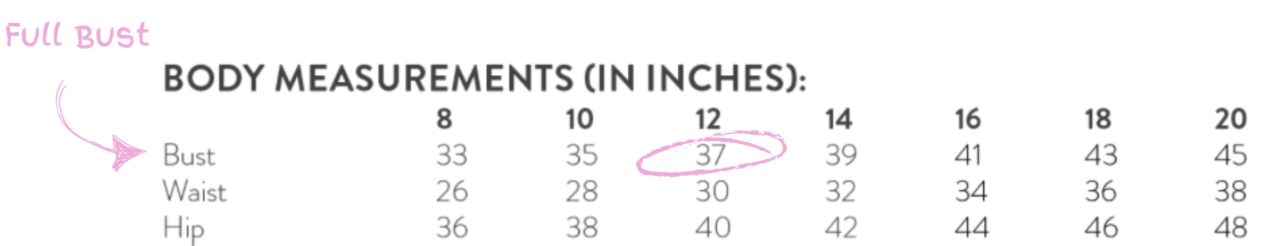 Then calculate the full bust adjustment (FBA) you need by noting the difference between your full bust and the full bust of the pattern.